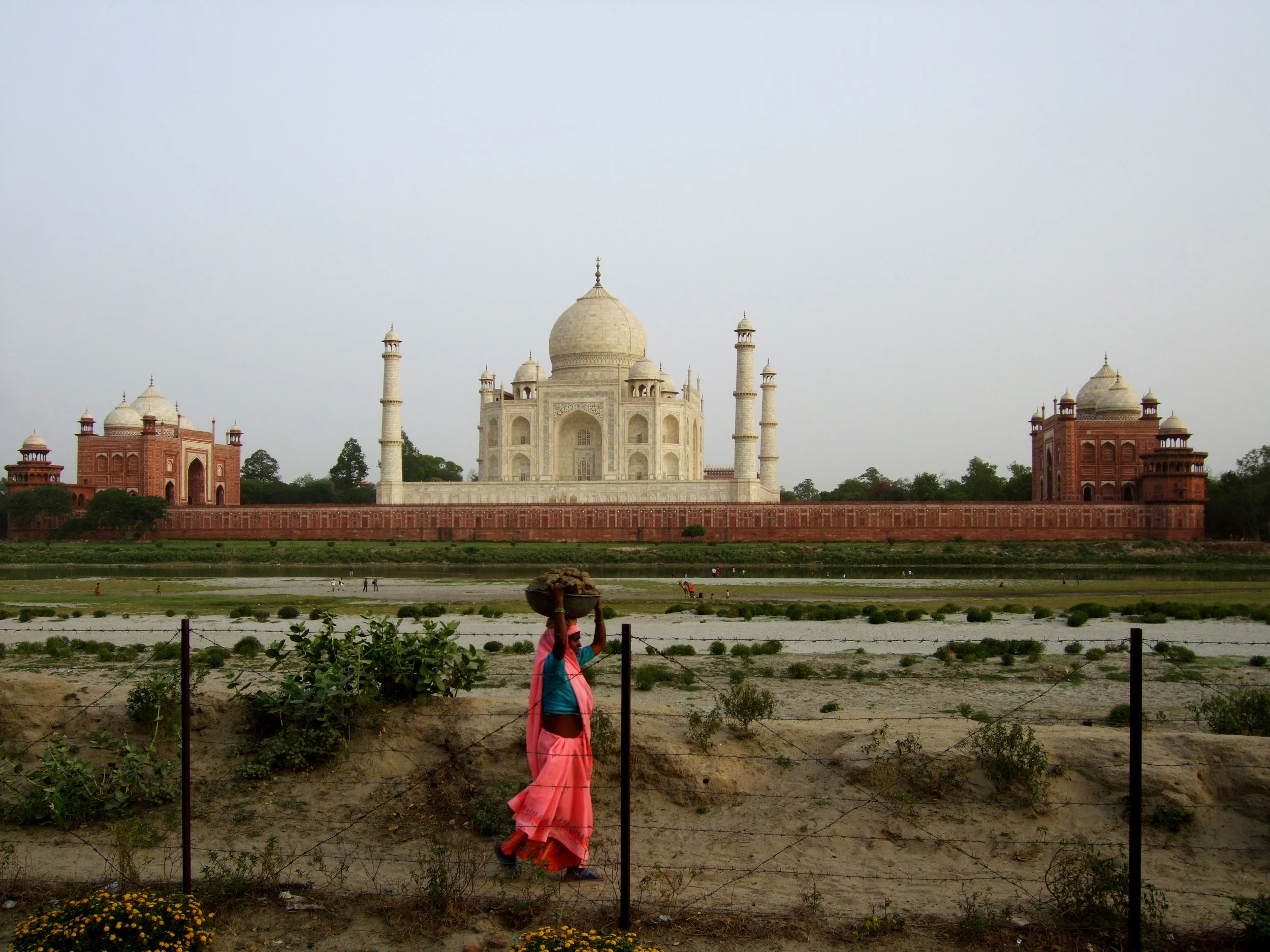 As the early evening light fades a woman carries a heavy load of cattle dung on her head while tourists pose for photos against the backdrop of the Taj Mahal.